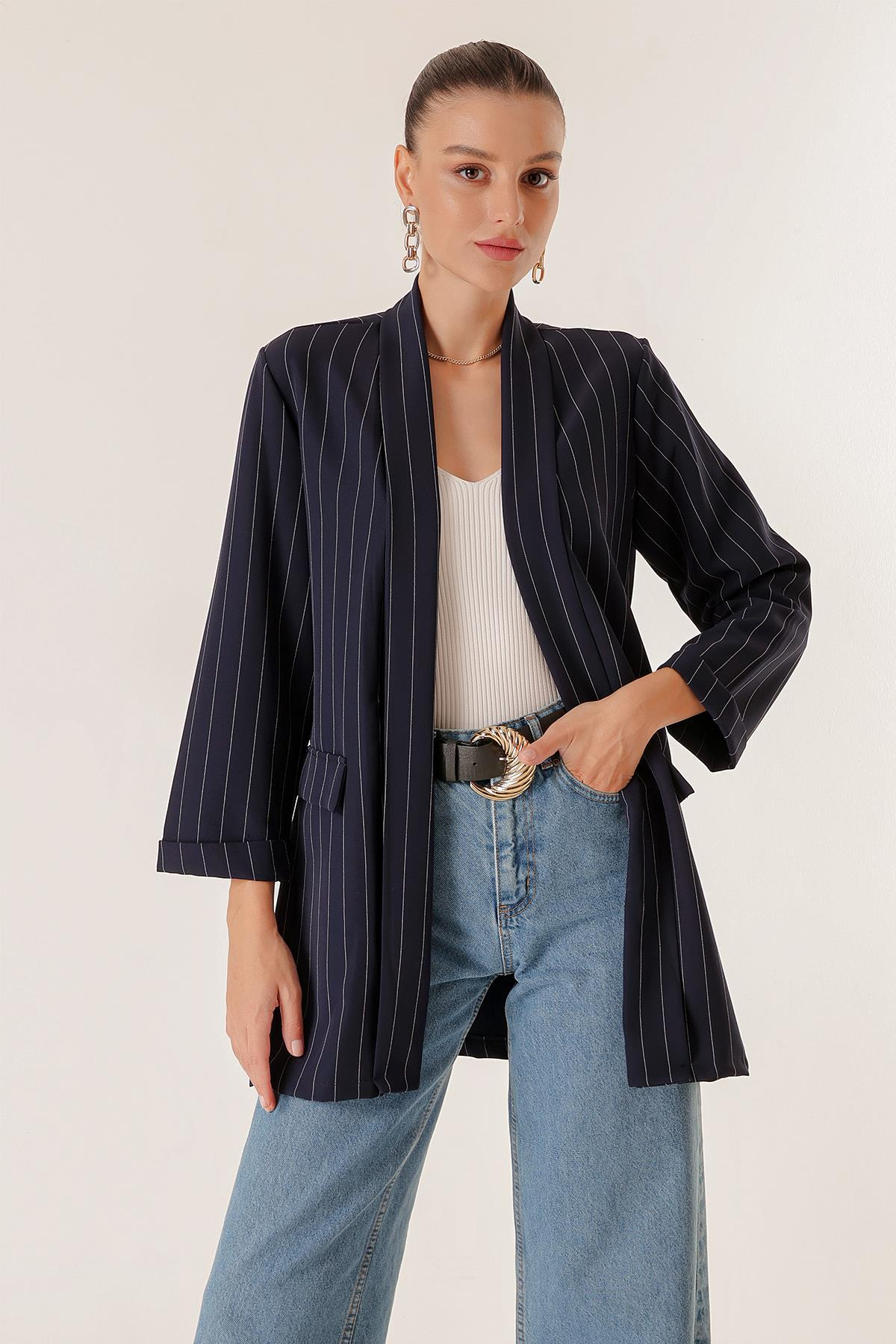 Şal Yaka Sahte Cepli En Boy Likra Boyuna Çizgili Uzun Ceket (S-23K4140022)