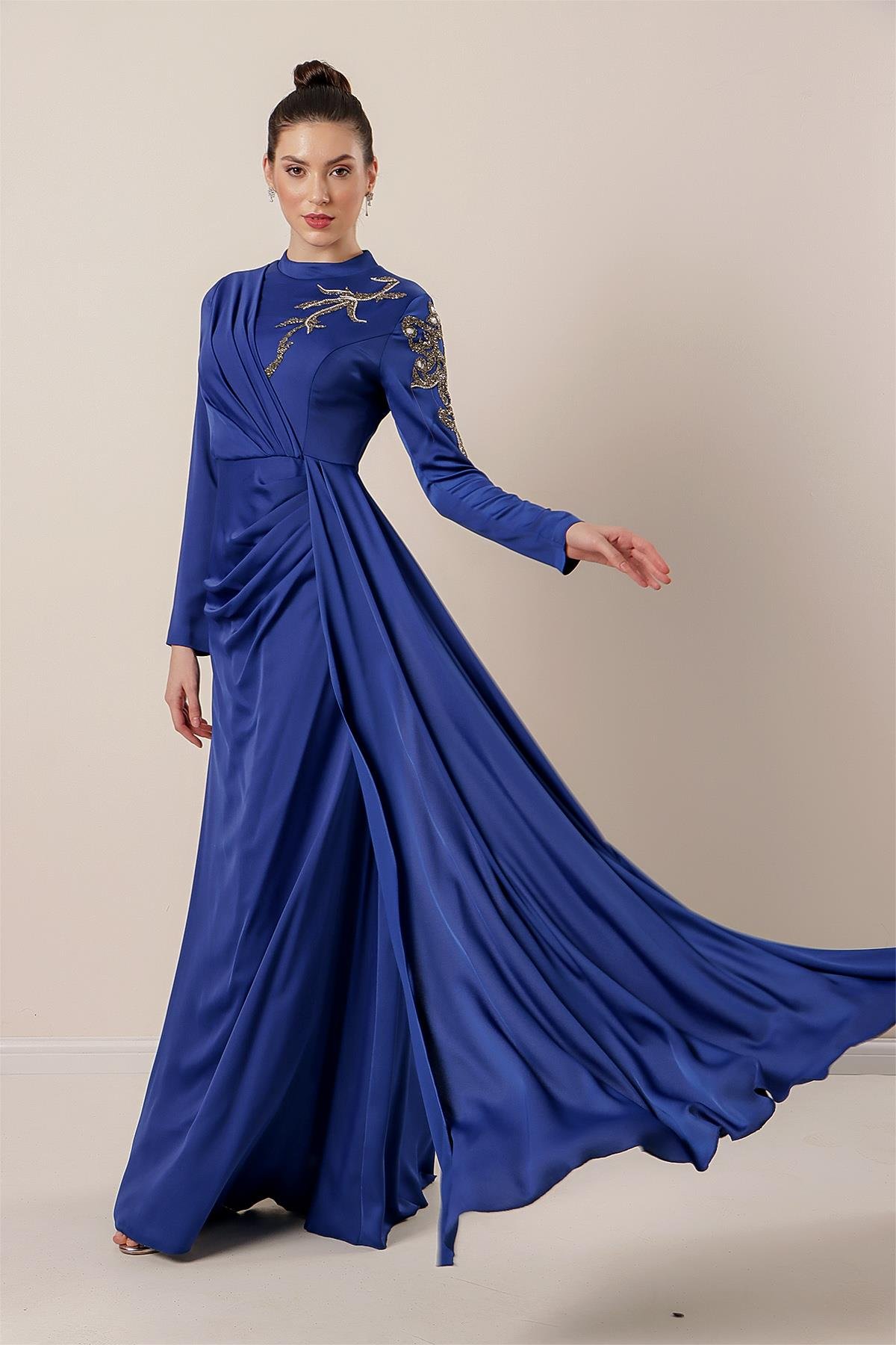 Taş İşlemeli Önü Büzgülü Astarlı Krep Saten Tesettür Elbise (S-22K1190015)