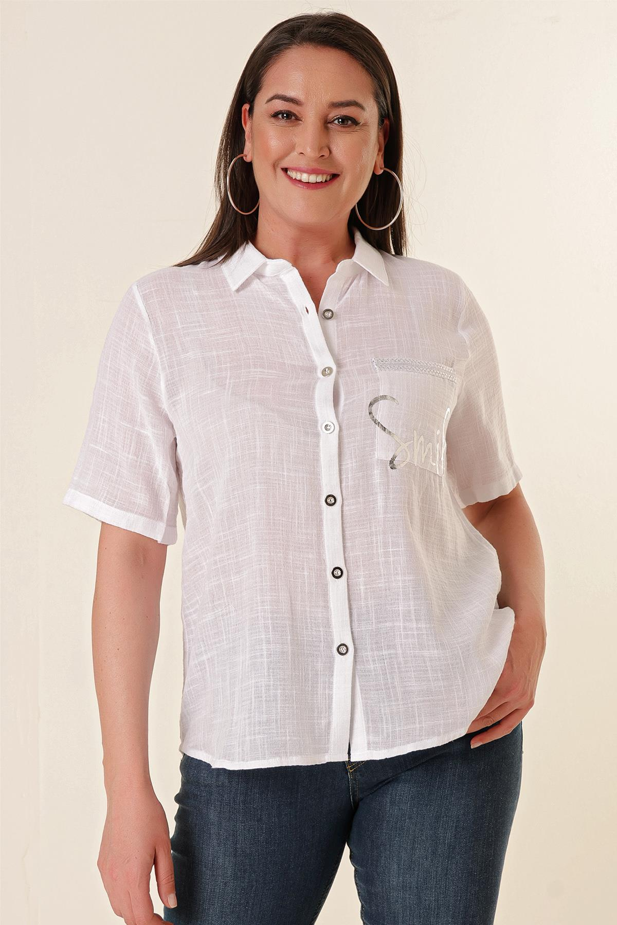 Tek Cepli Yazılı Kısa Kollu Büyük Beden Keten Gömlek (S-23K0990004)