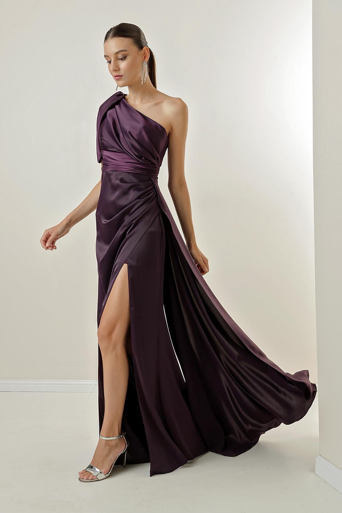 Tek Kollu Önü Drapeli Astarlı Saten Uzun Elbise (S-23K4120001)