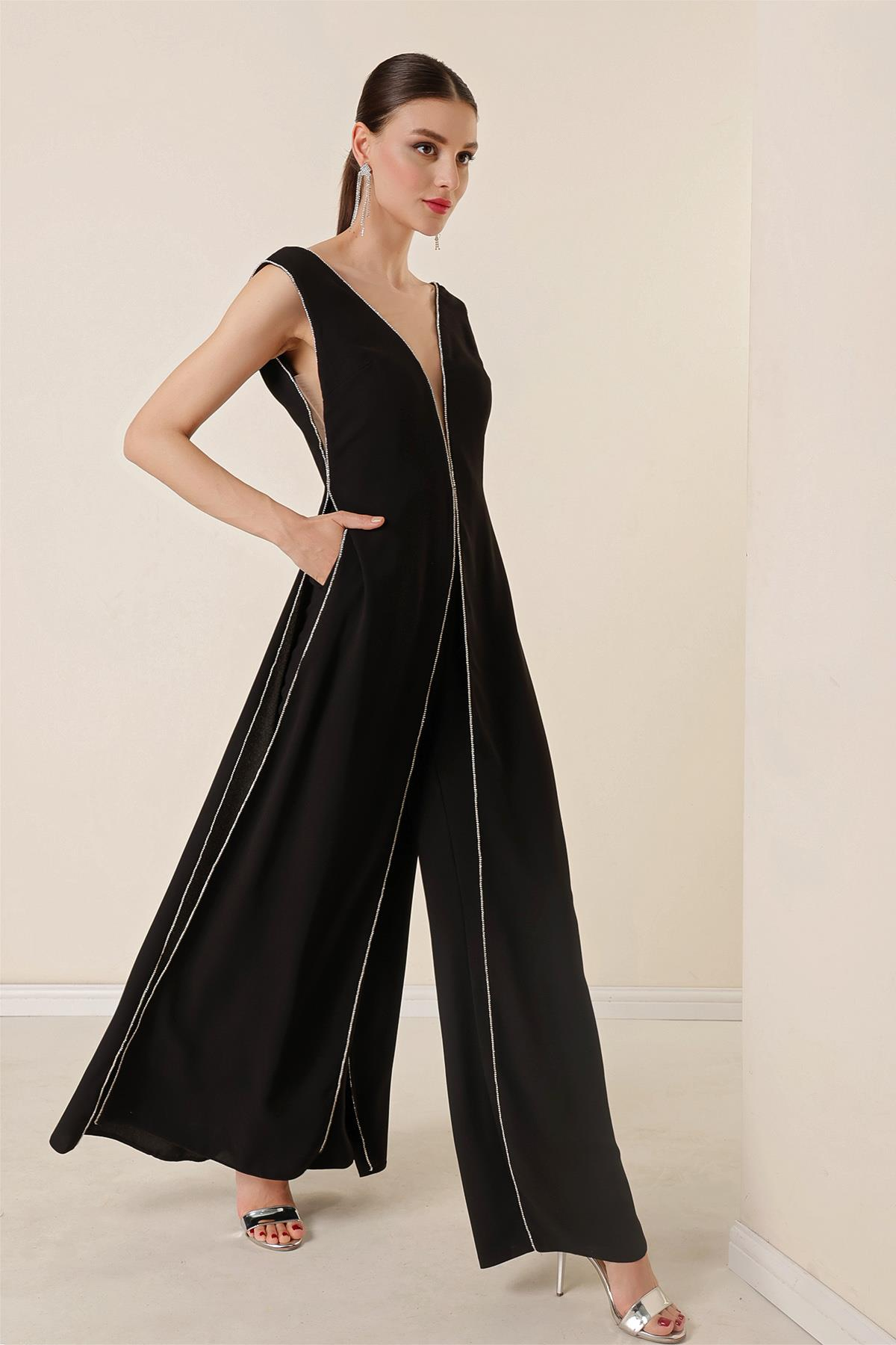 V Yaka Kalın Askılı Önü Ve Yanı Tül Detaylı Çift Yanı Ve Ortası Taş Detaylı Tulum (S-23K2580026)