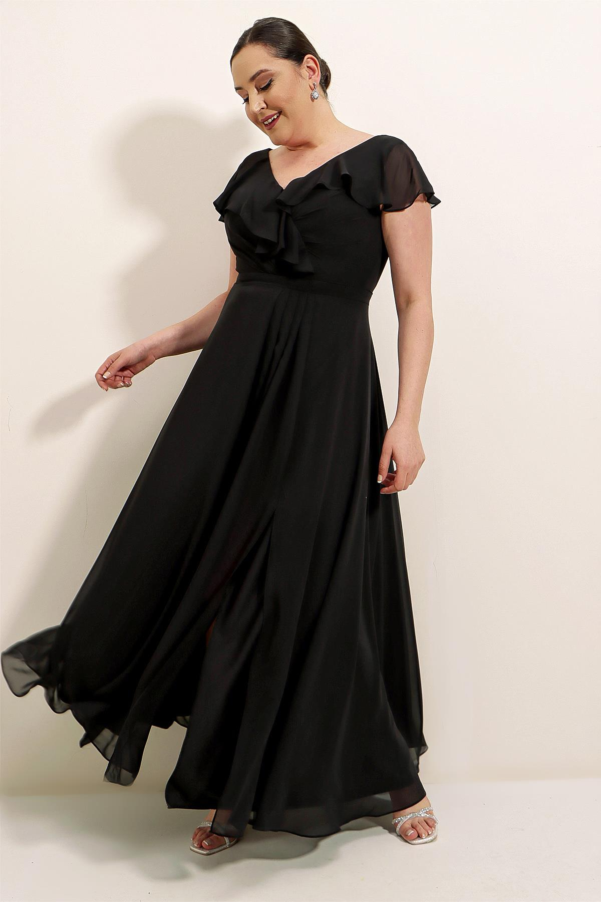 S-22K0230001Volanlı Pileli Astarlı Uzun Şifon B.B. Elbise