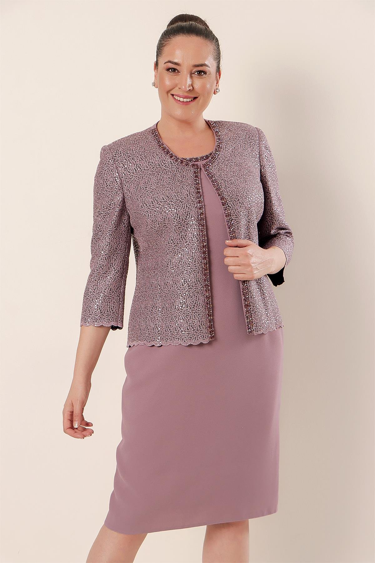 Yaka Taşlı Astarlı Krep Elbise Pulpayet Ceket Büyük Beden İkili Takım (S-21K3070028)