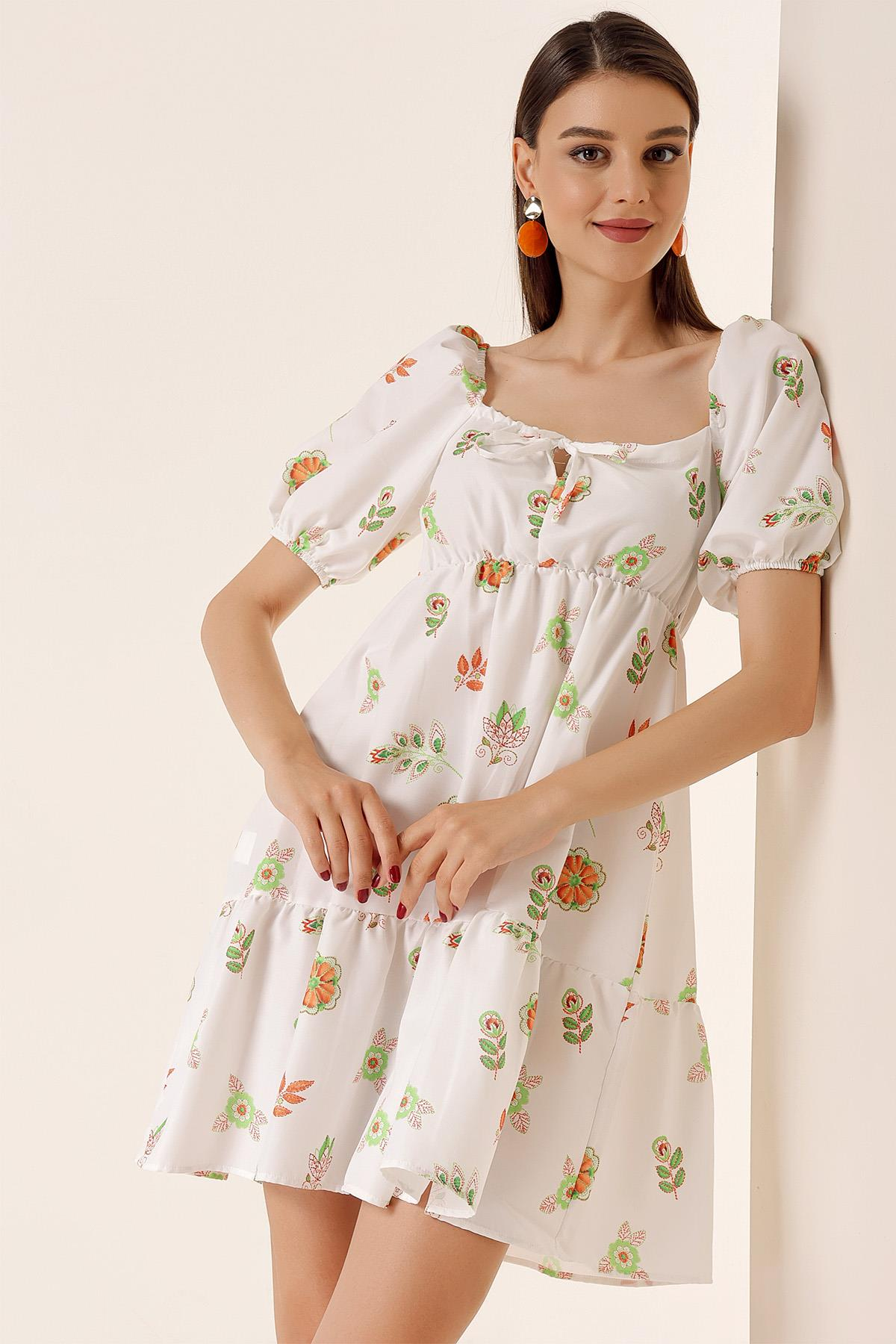 Yakası Bağcıklı Kısa Balon Kollu Çiçek Desenli Elbise (S-23K2060046)
