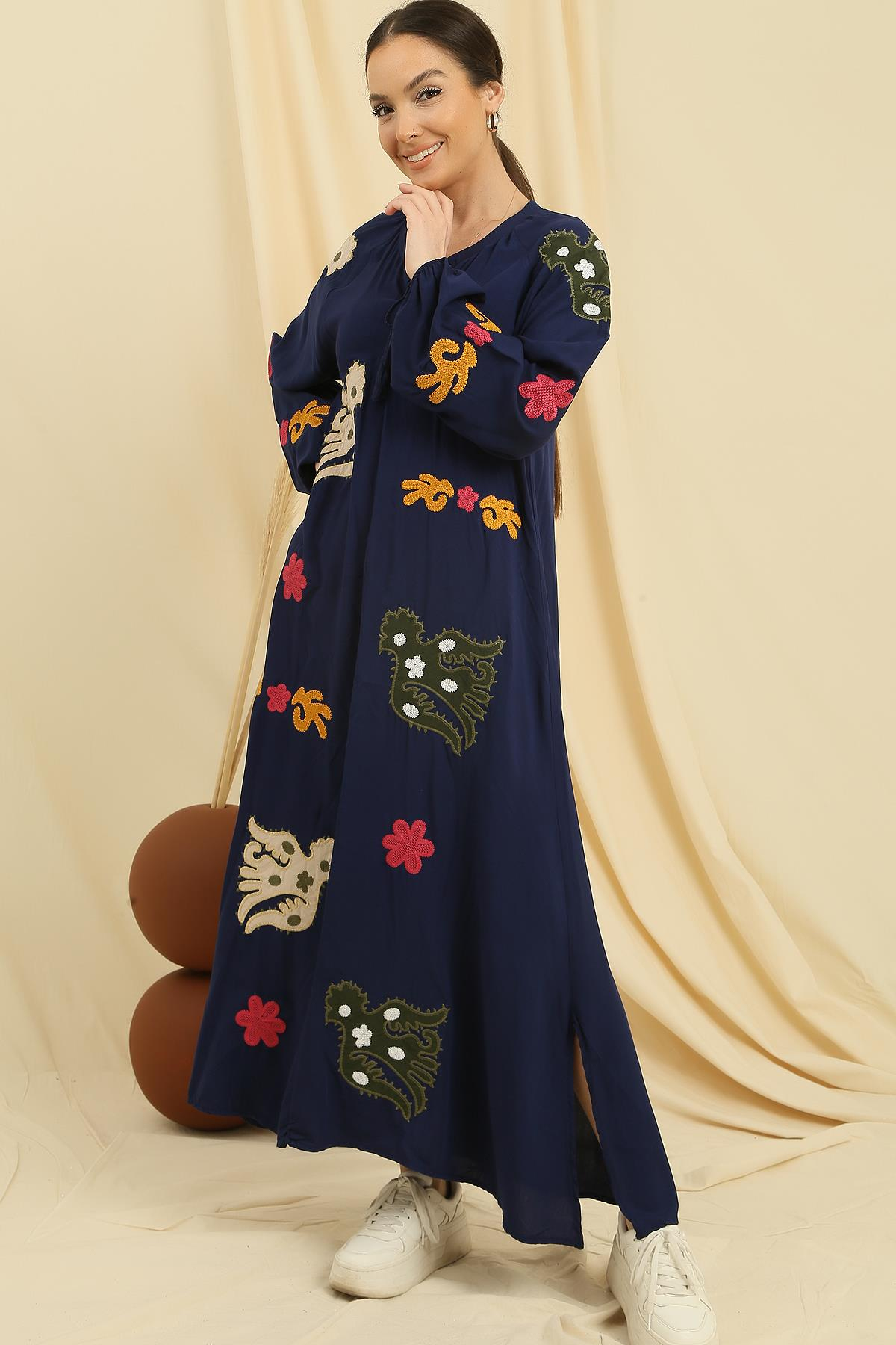 Yakası Bağcıklı Kuş Aplike Oversize Viskon Elbise (S-23K3880033)