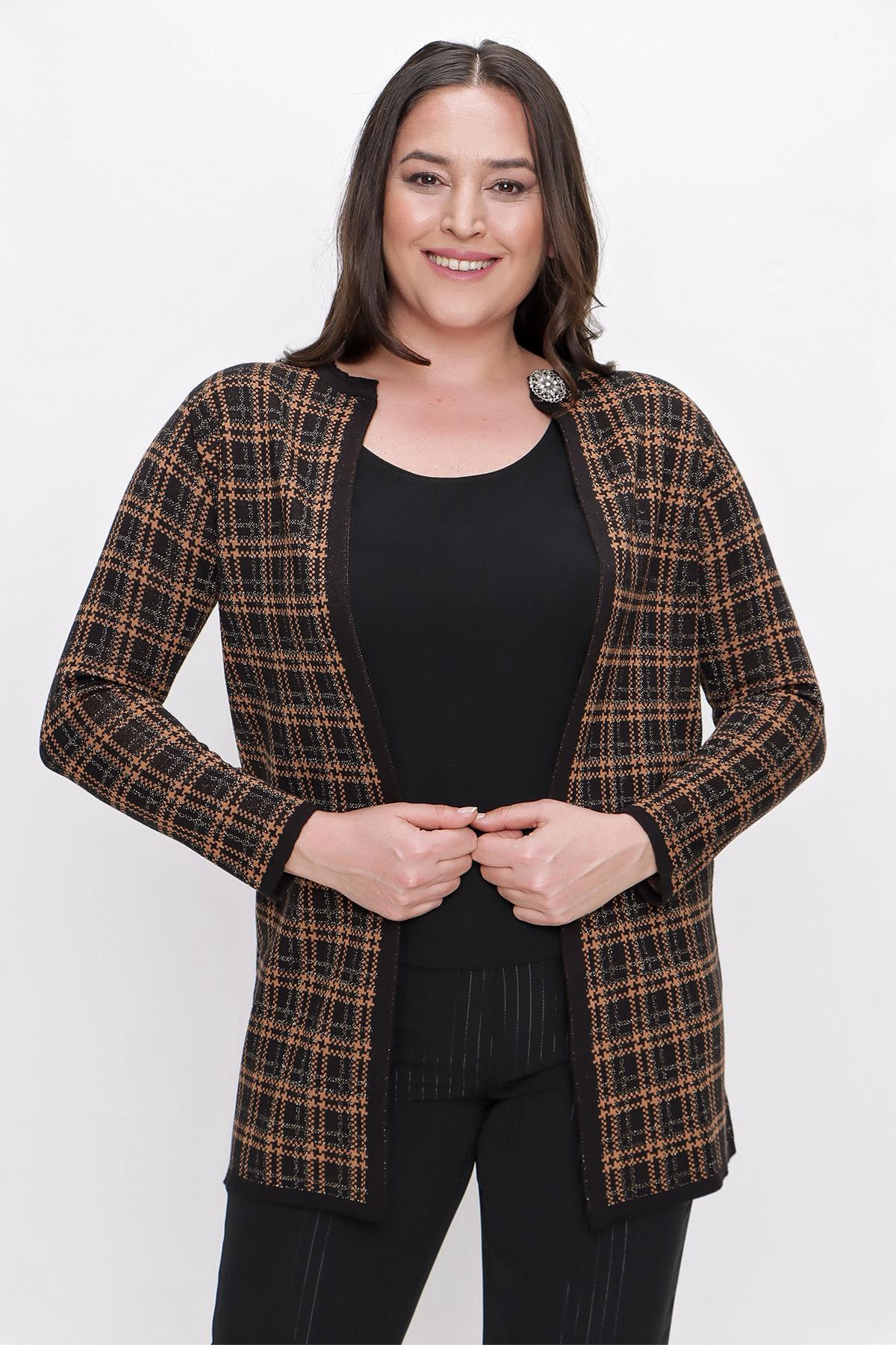 Yakası Broşlu Ekose Kazayağı Desen Akrilik Triko Büyük Beden Hırka (S-21K1770010)