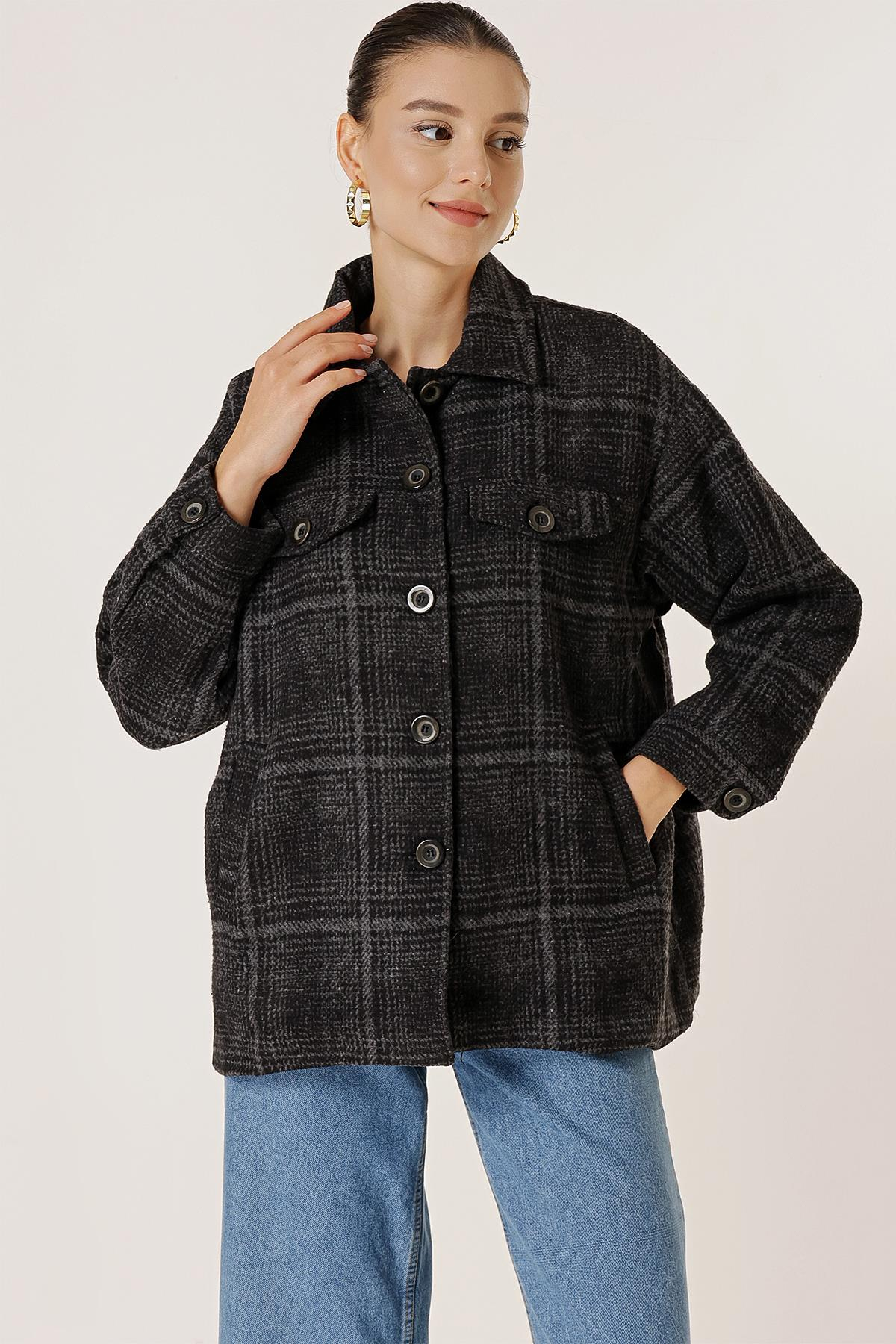 S-23K4200012Yandan Cepli İçi Astarlı Ekose Kaşe Ceket