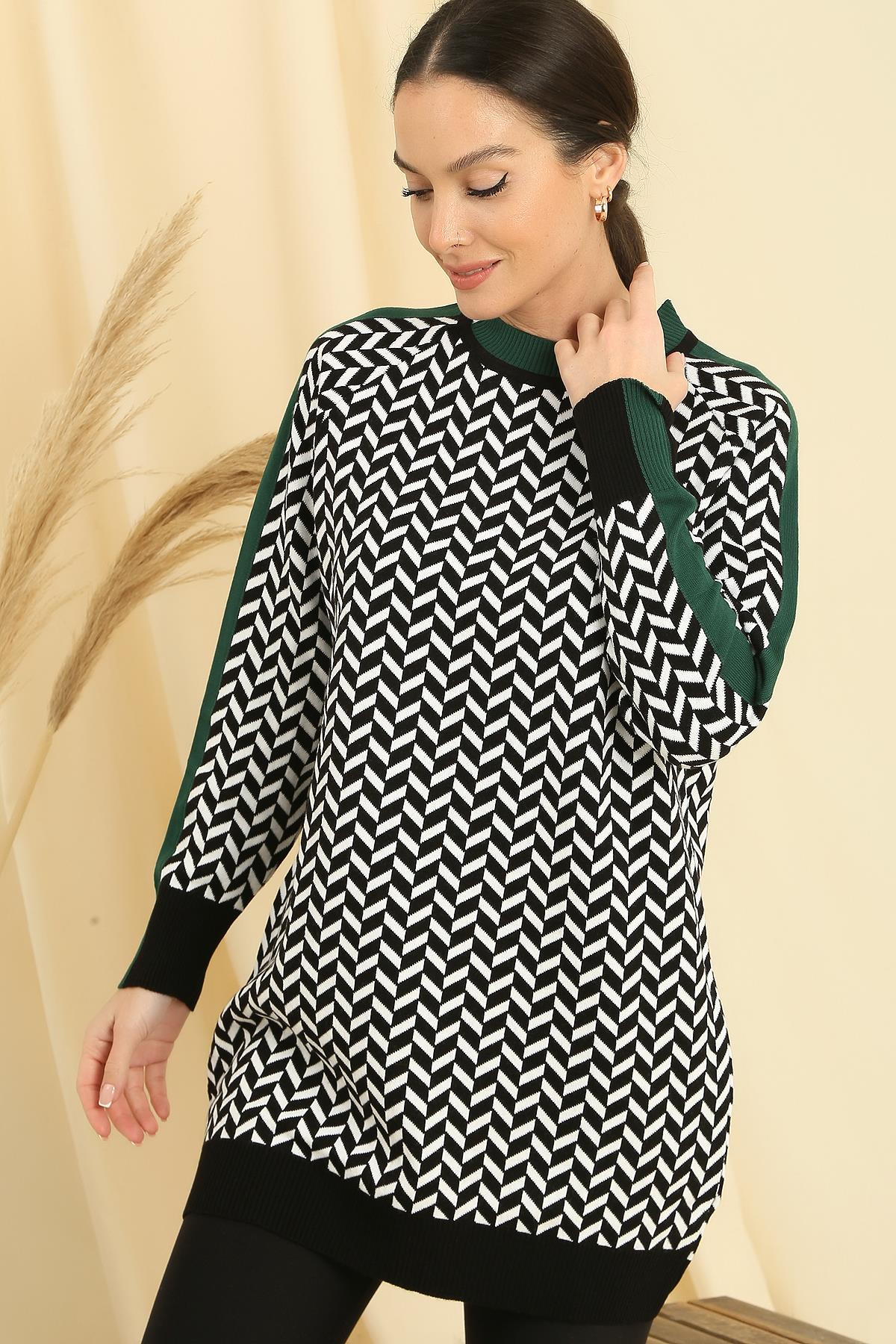 S-23K1800040Zikzak Desen Yaka Ve Kol Uçları Şeritli Rahat Kalıp Triko Tunik